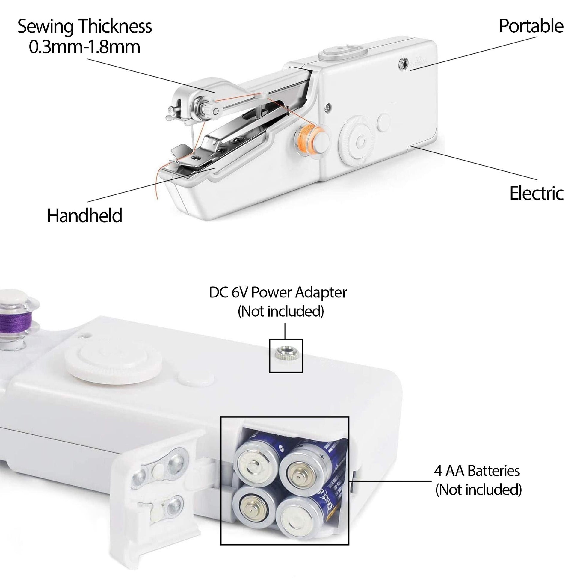 Lightweight & Portable Handheld Sewing Machine is lightweight and easy to carry, which is very suitable for on-site maintenance and emergency sewing during home or travel. Size: 2.75 x 8.26 x 1.57 inch Perfect For Almost Any Material Suitable for almost all fabrics with a thickness of 0.3mm-1.8mm (Stitch Length: 0-5mm): fabrics, clothing, silk, wool, curtains, etc. Simple In Use The manual sewing machine is equipped with 4 thread set points, which can be easily disassembled just by sewing with a button and an adjustable mounting plate. Power This product is powered by 4 AA batteries or 6V power supply (not included), you can quickly connect it to a flat edge with the touch of a button. Specifications: Max. Sewing Thickness: 0.3mm-1.8mm Stitch Length: 0-5mm Power: DC 6V/1200mA or 4 AA batteries
